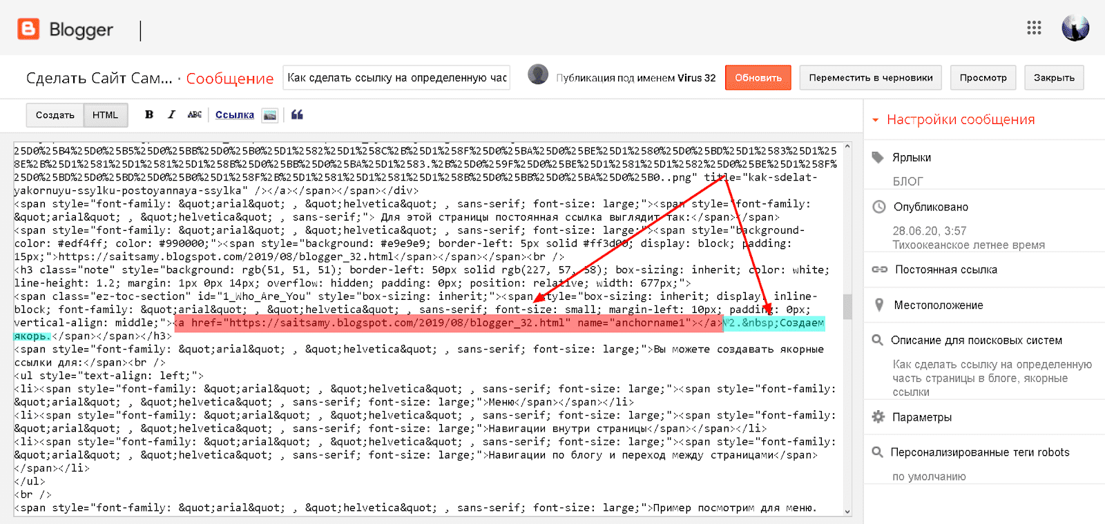 Показываю на примере Blogger, но процесс одинаковый для любого ресурса.В редакторе сообщений, нажимаем «ПОСТОЯННАЯ ССЫЛКА» в боковом меню справа: